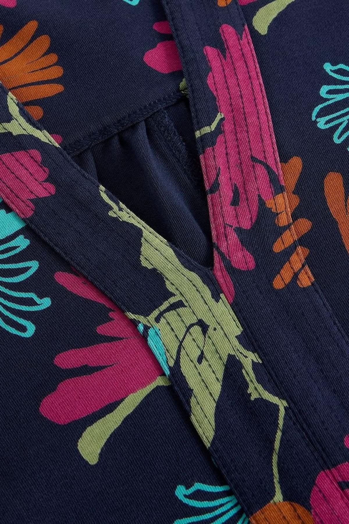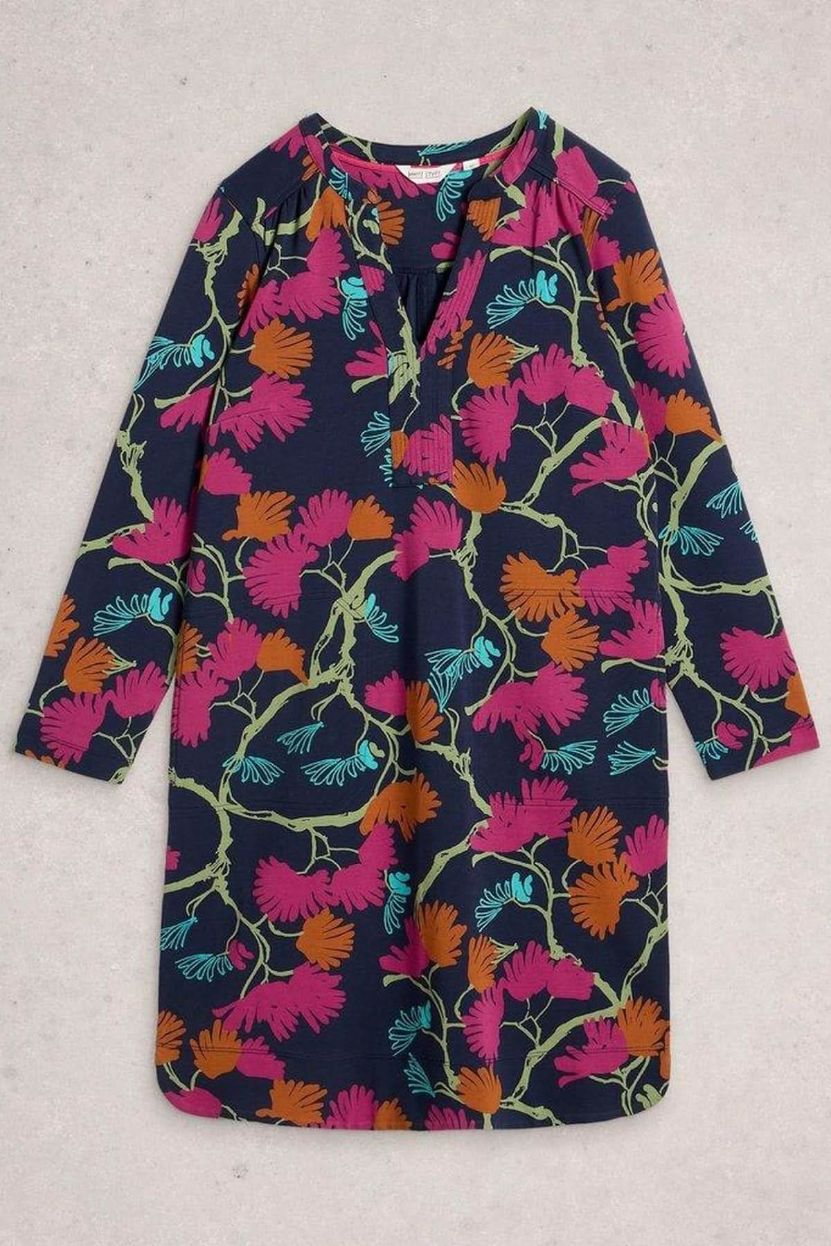 Description: Robe droite en jersey fluide avec col tunisien et manches 3/4, facile à enfiler et agréable au quotidien. L’imprimé botanique apporte du caractère tandis que la coupe au-dessus du genou garde une allure décontractée chic. Conseil style : porte-la avec des baskets ou des bottines et une veste en denim.