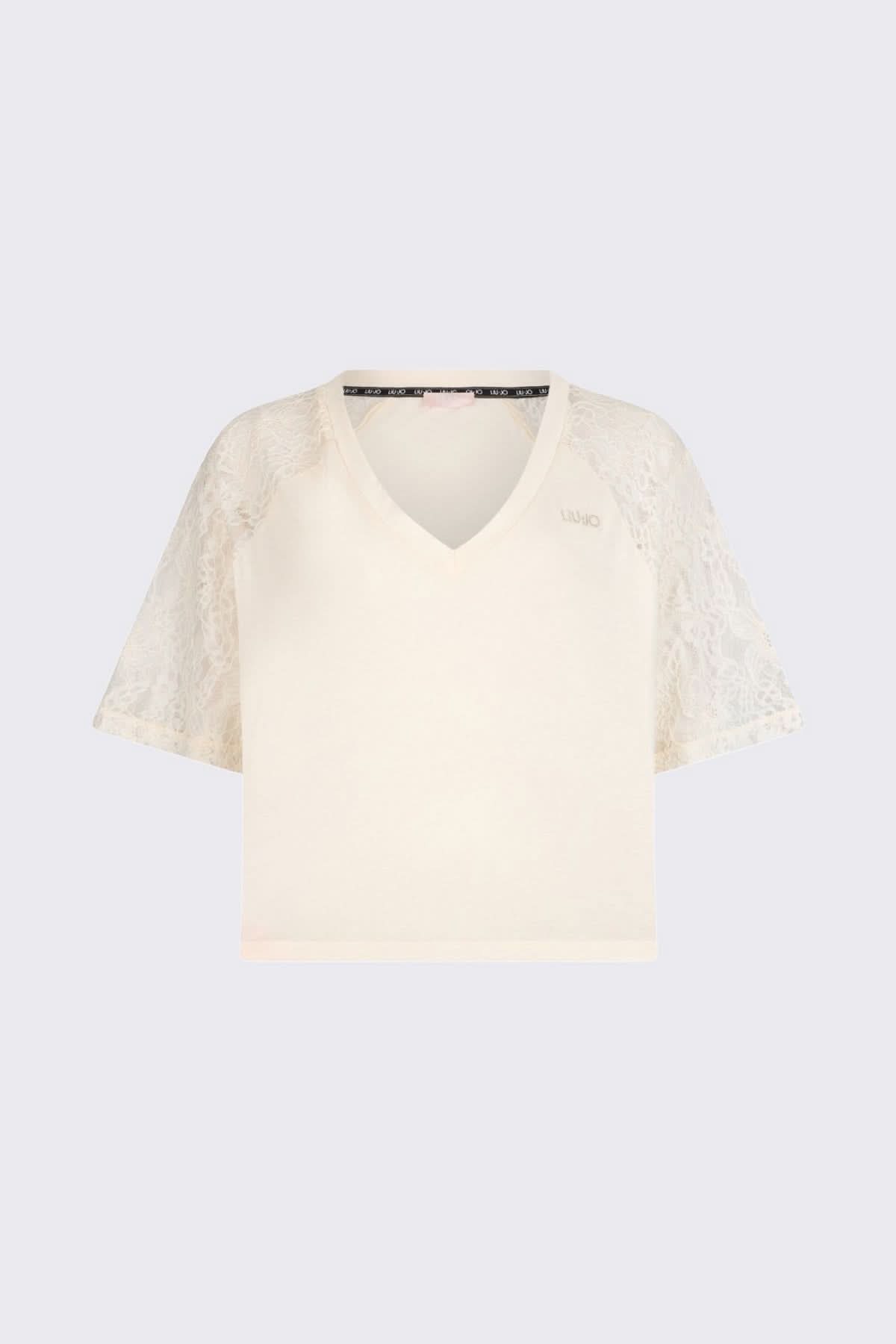 Ce t-shirt propose une silhouette féminine et raffinée grâce à son col en V élégant et ses manches en dentelle délicate. Sa coupe fluide offre un confort optimal tout en apportant une touche sophistiquée aux tenues du quotidien. Facile à agencer, il se porte aussi bien avec un pantalon habillé qu’un denim.
