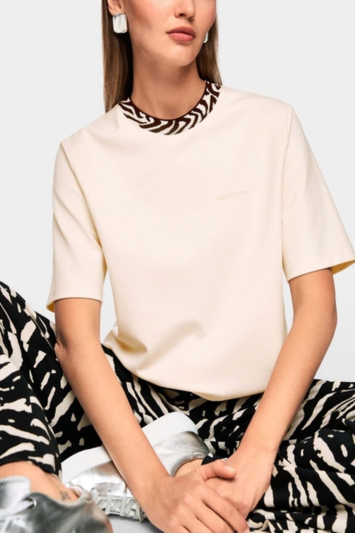 Description : T-shirt décontracté de coupe droite et aux manches légèrement plus longues. Ce t-shirt est confectionné dans un mélange doux de coton, ce qui le rend très agréable à porter. Le col est de couleur contrastée. Un petit logo Marc Cain Sport est apposé sur le devant et dans le bas du dos.