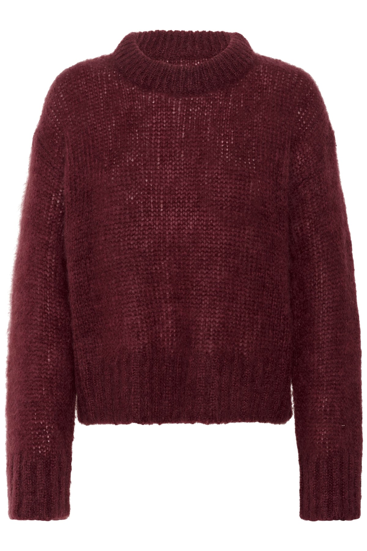 Tricot Sile à col rond, coupe ample, maille duveteuse, couleur bordeaux, parfait pour un look cosy et moderne.