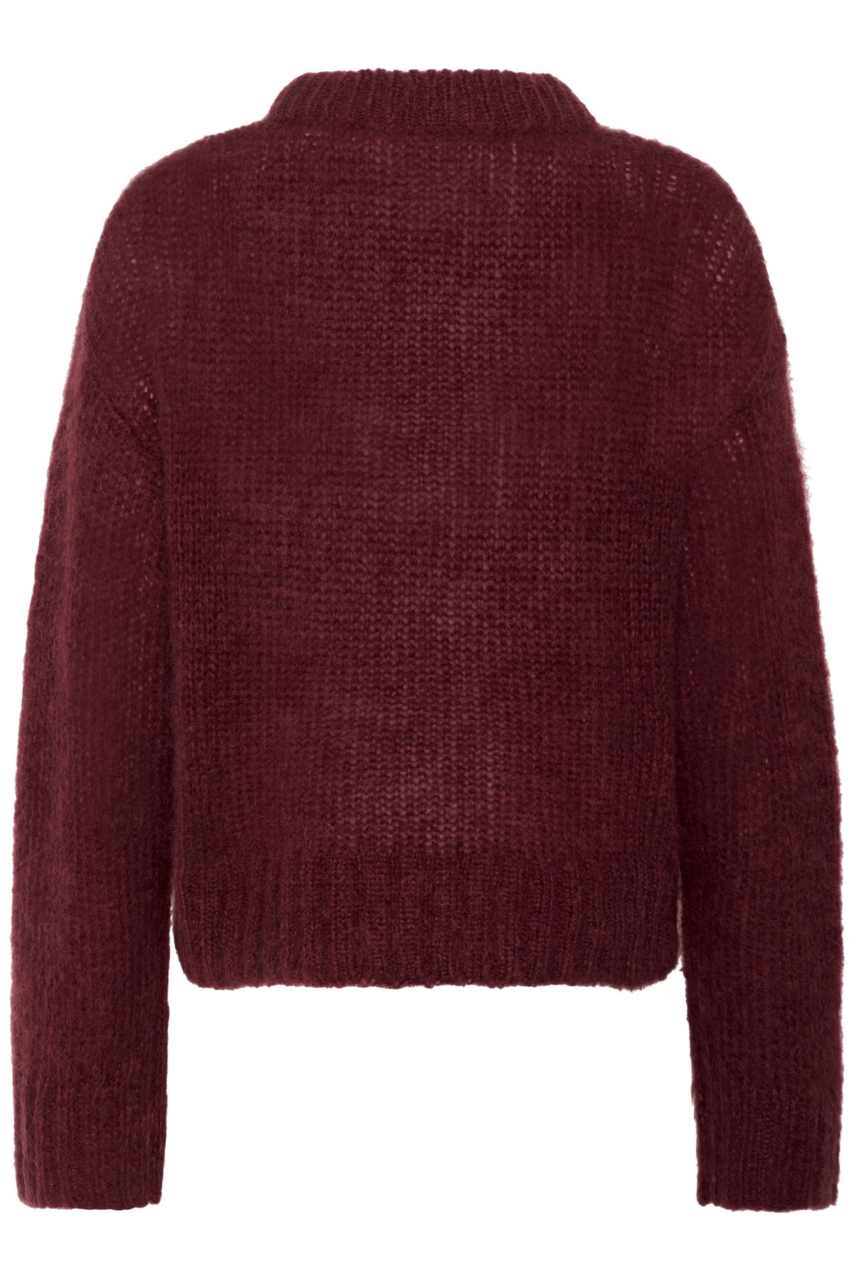 Tricot Sile à col rond, coupe ample, maille duveteuse, couleur bordeaux, manches longues et poignets côtelés.