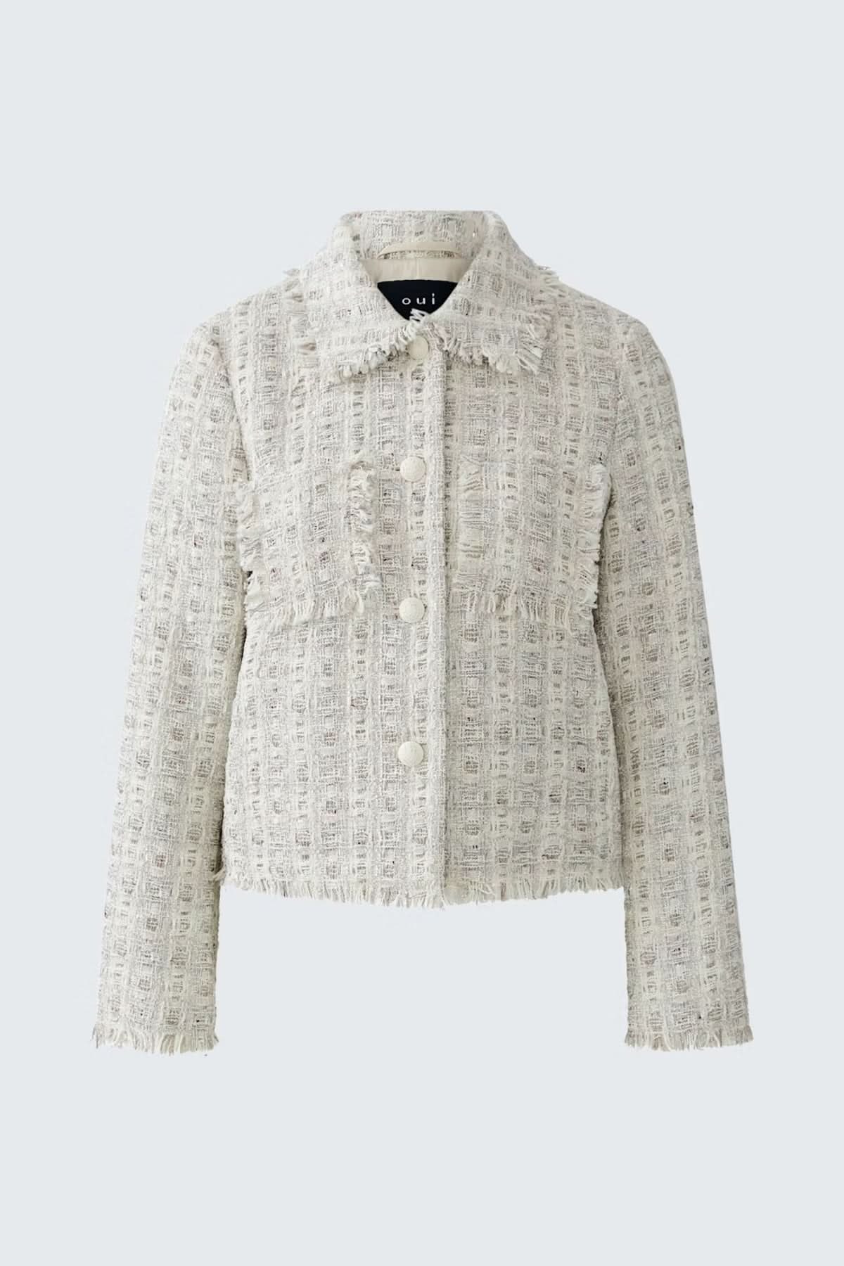 Veste en tweed élégante avec coupe droite et finitions effilochées, boutons recouverts et col chemise, style chic et intemporel.