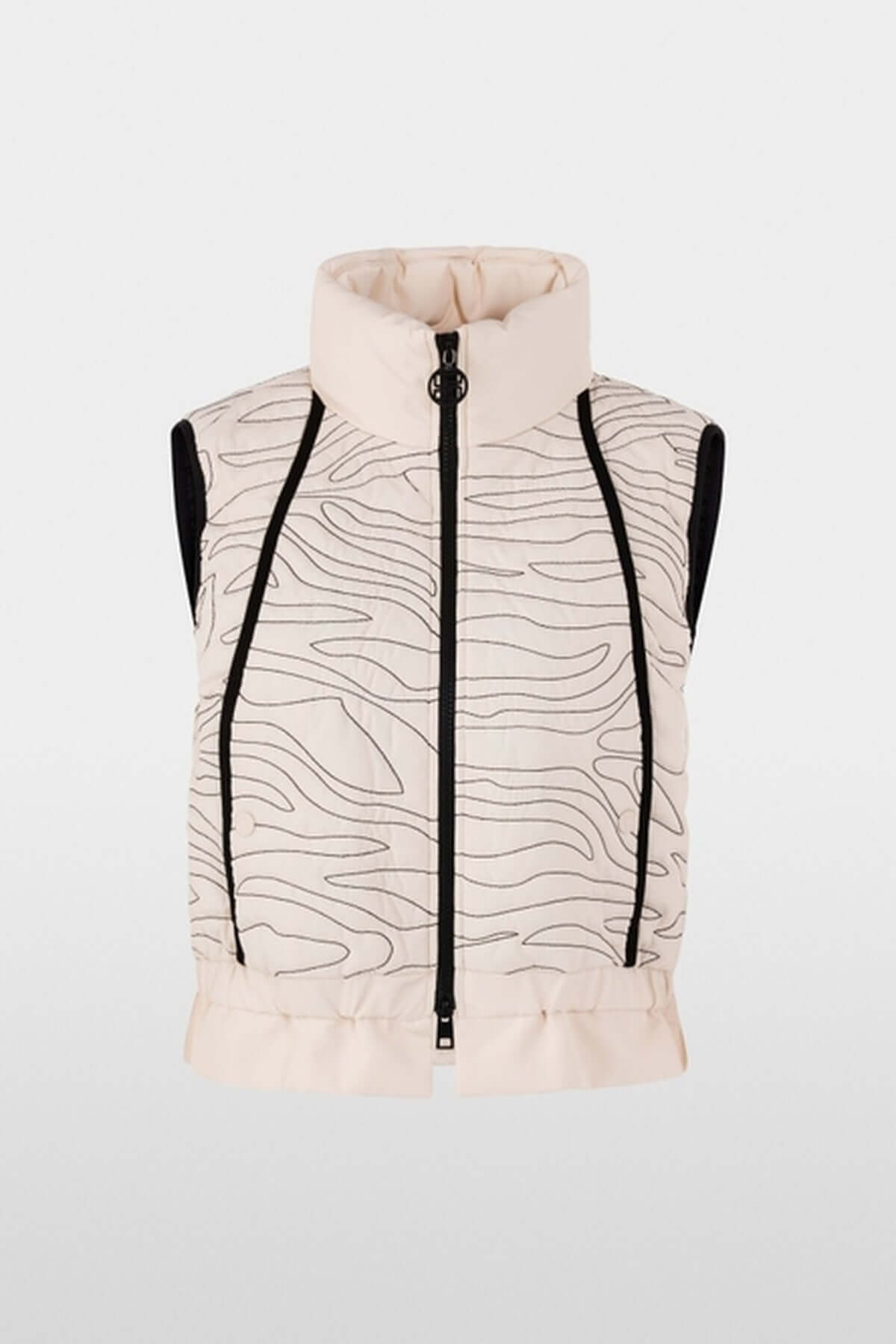 Description : Veste matelassé avec surpiqûres ondulées et coutures spéciales. La coupe ample confère à ce gilet une touche moderne. Celle-ci est également soulignée par la ceinture élastique et la rangée de volants qui y est fixée. Le col montant matelassé assure la chaleur lors des journées plus fraîches. Des poches latérales complètent le look. Le gilet se ferme à l'aide d'une fermeture éclair.