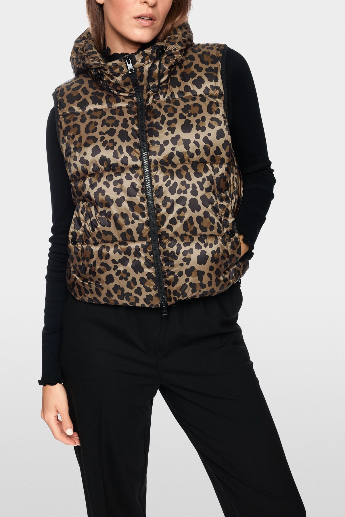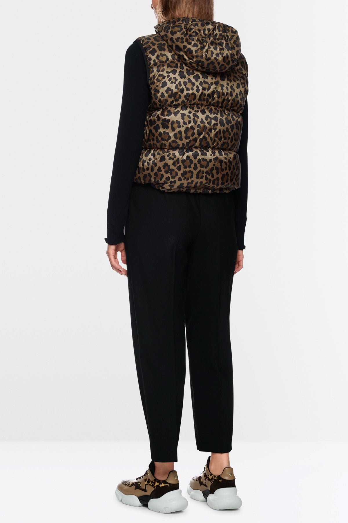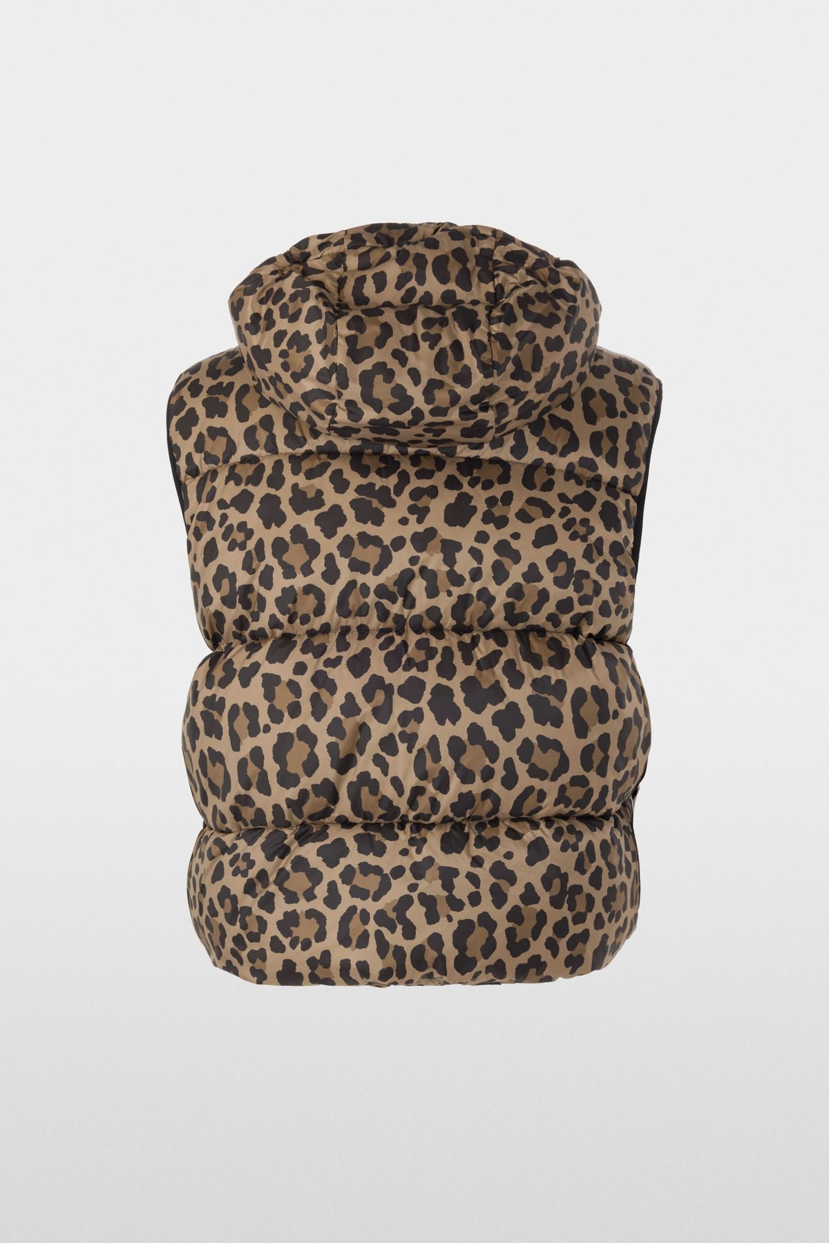 Veste matelassée à imprimé léopard et capuchon sans manches, élégance intemporelle, idéale pour la mi-saison.