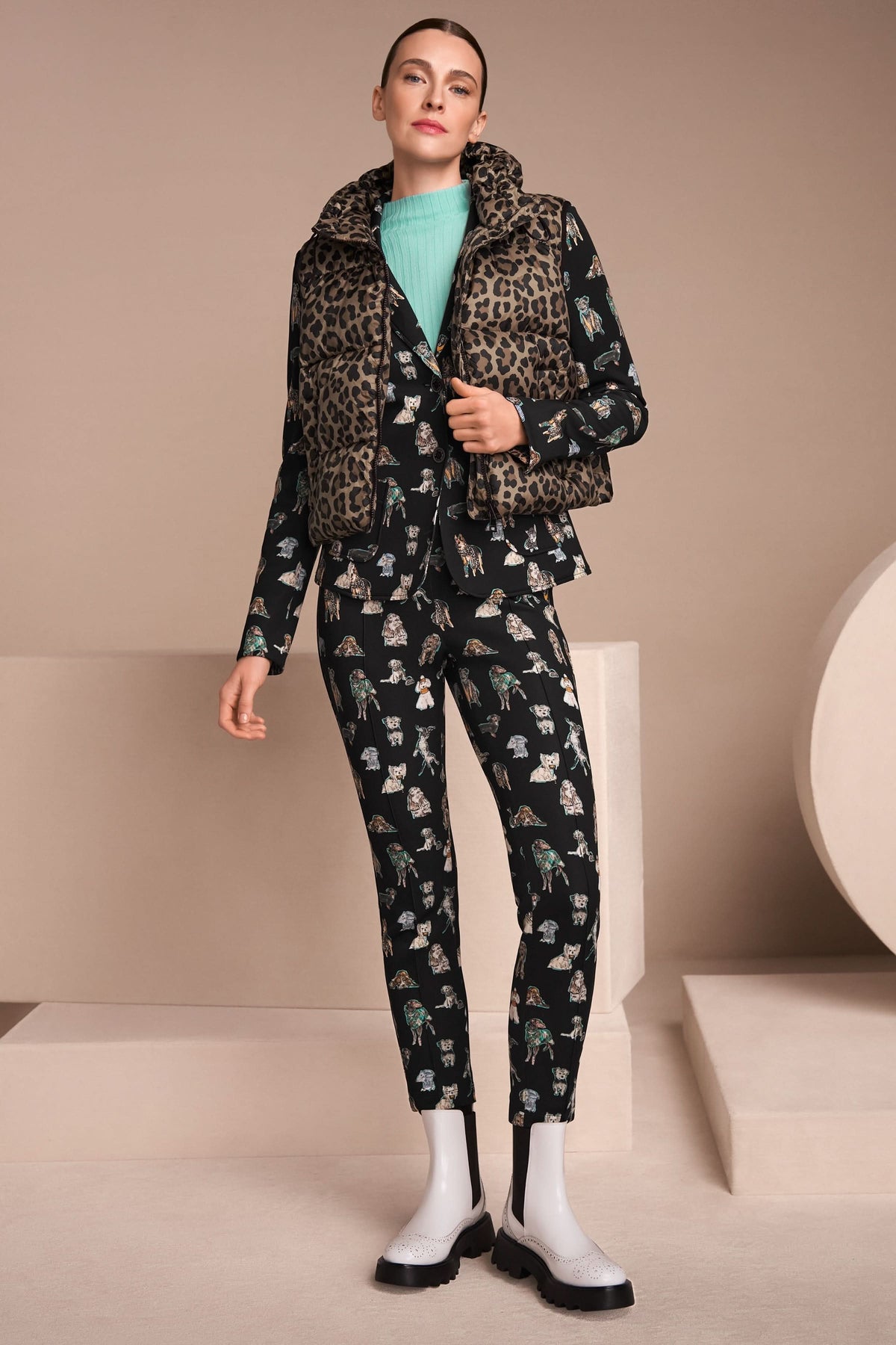 Femme portant une veste matelassée à imprimé léopard et capuchon, associée à un ensemble chic, ambiance élégante.