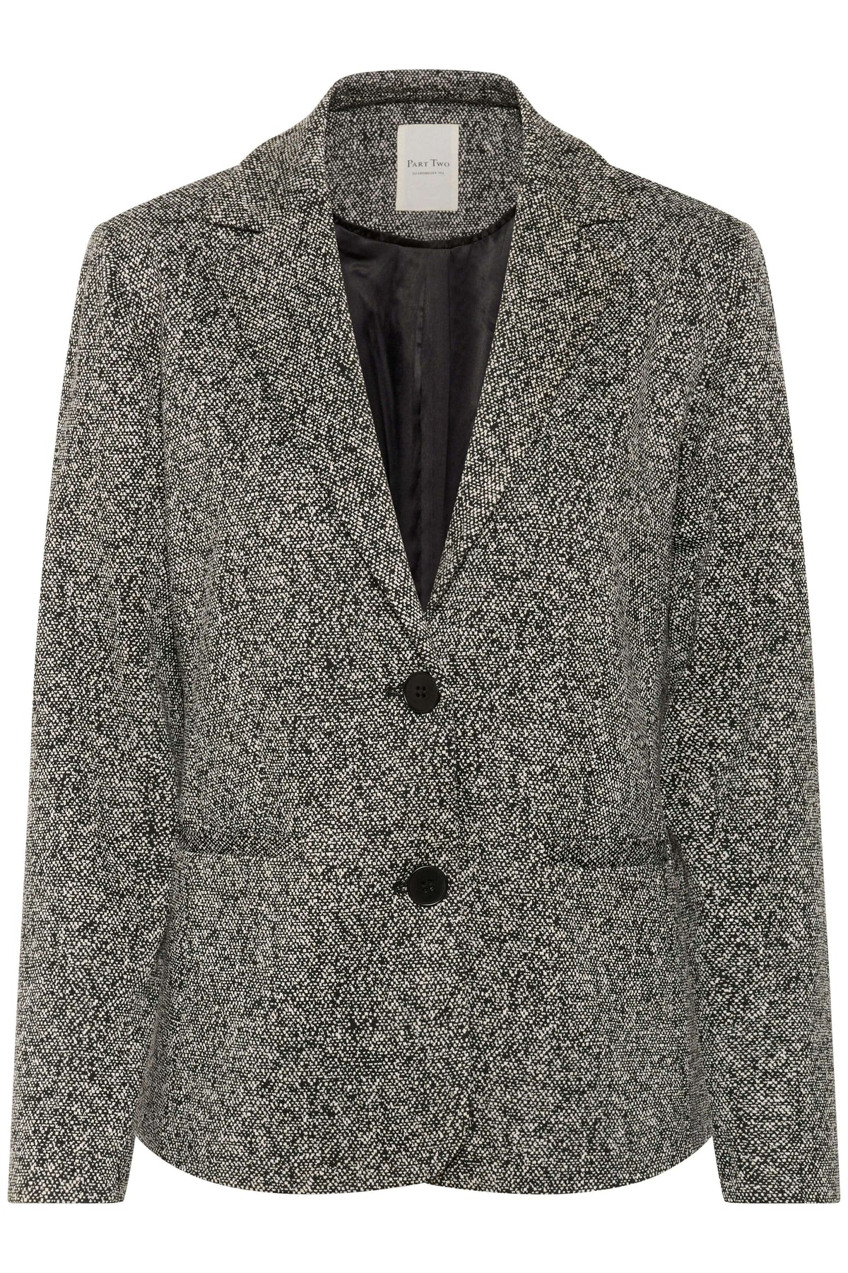 Veston Vineke noir et blanc, coupe structurée, reverse crantés, textile texturé et moderne.